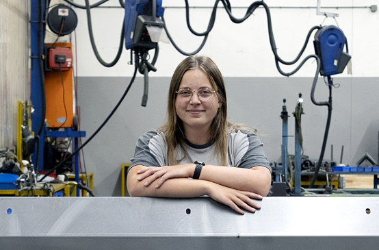 Vera Koch (23) werkt bij Aebi Schmidt Group als lasrobotprogrammeur en lascoördinator. Op de afdeling Fabricage programmeert ze de robots die frames en onderdelen voor strooimachines lassen en bewaakt ze de kwaliteit van begin tot eind. Haar passie voor techniek ontstond al vroeg, geïnspireerd door haar vader. Na de opleiding Technicus Engineering groeide Vera bij Aebi Schmidt door van junior programmeur tot specialist.